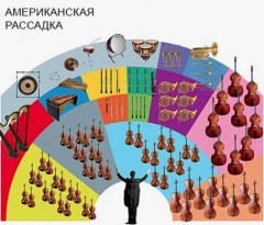 Оркестр в современном значении - это группа музыкантов, которые исполняют вместе одно музыкальное произведение. Каждый музыкант играет свою партию по нотам, которые называется партитура. Партитуры стоят на специальных подставках - пультах. Чтобы оркестр звучал слаженно, гармонично - им управляет дирижёр. Он стоит лицом к музыкантам. Перед дирижером лежат толстыетолстые ноты, в которых расписаны партии всех музыкантов. Называются такие ноты - клавир. Существуют разные виды оркестров: симфонический, духовой, струнный, народный, эстрадный, джазовый. Они различаются по составу инструментов и по количеству музыкантов. Количество музыкантов может варьироваться и зависит от конкретного музыкального произведения. В симфоническом оркестре, в среднем, около 60-70-ти человек, но бывает, что состав достигает 100 и более участников. В основных чертах (количество групп, состав инструментов) симфонический оркестр сложился в эпоху ранней венской классики в связи с появлением нового крупного жанра - классической симфонии (отсюда специфическое название оркестра). Позднее «симфонической» стала называться вообще любая музыка для данного инструментального состава - в том числе и созданная композиторами мировых национальных школ. В отечественном музыковедении принято выделять два вида симфонического оркестра: большой и малый. Основу большого симфонического оркестра составляют четыре группы инструментов: струнные смычковые, деревянные духовые, медные духовые и ударные. В ряде случаев в оркестр включаются и другие инструменты (прежде всего, арфа, фортепиано, челеста, клавесин). За время появления симфонических оркестров сменилось множество вариантов расположения музыкантов. Время помогло выработать определённый принцип расположения симфонического оркестра. Во-первых - музыканты хорошо видят дирижёрскую палочку, если их рассадить веерообразно, а дирижёра поместить в месте предполагаемой оси веера. Во-вторых - все однородные инструменты целесообразнее собрать вместе - в одну линию или группу. Это позволяет музыкантам лучше слышать друг друга в совместной игре и создает компактное, согласованное звучание каждой оркестровой группы. В-третьих - звучность зависит и от того или иного размещения этих групп по отношению друг к другу. Так как сила звука и количество инструментов в каждой группе оркестра не одинаковы, то хорошая рассадка помогает добиться равномерного звучания всего оркестра. Ко второй половине XX века сложились два основных типа рассадки оркестра - немецкий и американский. В России чаще используется американская рассадка особенность которой заключается в следующем - вдоль рампы располагаются первые скрипки (слева) и виолончели (справа). Вторые скрипки сидят позади первых, альты сидят за виолончелями справа. Контрабасы находятся за спиной у виолончелей. Посередине сцены расположены два ряда деревянных духовых инструментов (флейты, гобои и кларнеты, фаготы). За ними располагаются медные инструменты - трубы, валторны, тромбоны и туба. Ударные инструменты расположены дальше всего от слушателя - от левого края до центра сцены, где обычно расположены литавры. Арфы находятся с левой стороны от дирижёра.