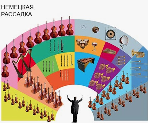 Немецкая рассадка отличается от американской тем, что виолончели меняются местами со вторыми скрипками, а контрабасы - слева. Медные духовые инструменты сдвигаются направо, в глубь сцены, а валторны смещаются налево. Ударные при такой раскладке располагаются ближе к правой кулисе. Решение о том, каким способом рассадить оркестр, принимает дирижёр.