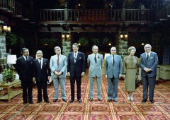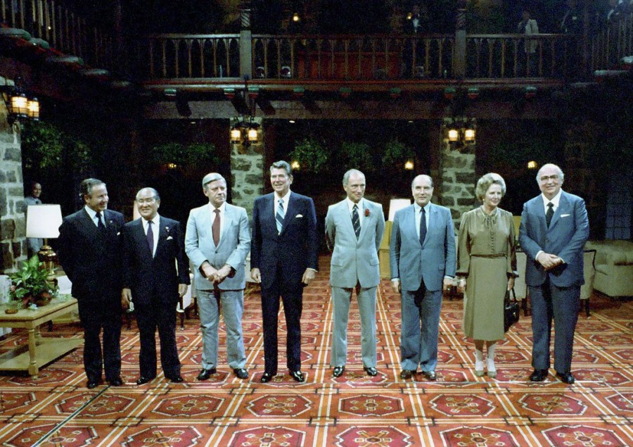 Лидеры G-7 на экономическом саммите в замке Монтебелло в Оттаве, Канада. Слева направо: Гастон Торн (7-й Председатель Европейской комиссии), Дзэнко Судзуки (премьер-министр Японии), Хельмут Шмидт (5-й Федеральный канцлер ФРГ), Рональд Рейган (40-й президент США), Пьер Трюдо (15-й премьер-министр Канады), Франсуа Миттеран (21-й президент Франции), Маргарет Тэтчер (премьер-министр Великобритании), Джованни Спадалини (65-й Председатель Совета министров Италии), (20.07.1981)
