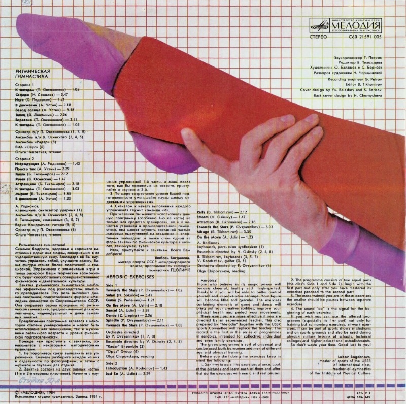 Сколько бодрости, здоровья и хорошего настроения дарит она людям, поверившим в ее чудодейственную силу. Благодаря ей Вы научитесь управлять собой, улучшите осанку, Ваша фигура станет более пластичной и грациозной. Упражнения с элементами игры и танца раскроют Ваши творческие возможности, будут способствовать совершенствованию физической и двигательной культуры. Занятия ритмической гимнастикой наиболее эффективны под руководством опытного преподавателя. Эту роль выполнит данная пластинка, подготовленная фирмой «Мелодия» совместно со Спорткомитетом СССР. Она открывает серию программ по ритмической гимнастике, предназначенных для коллективных, индивидуальных и даже семейных занятий.