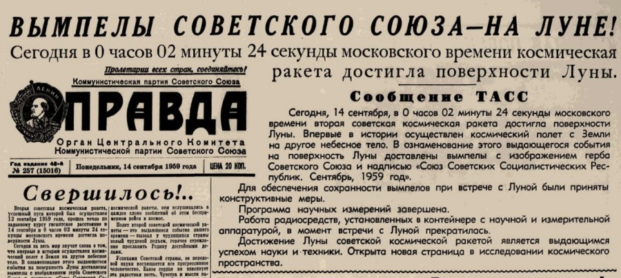 - «12» сентября 1959 года в 09:39:42 по московскому времени был успешно осуществлён запуск следующей АМС серии, получившей название «Луна-2». В массовой советской печати того времени эта АМС называлась «вторая советская космическая ракета». Как и в случае «Луны-1», при запуске использовался метод непрерывного разгона АМС без выхода на промежуточную околоземную орбиту. «14» сентября 1959 года в 00:02:24 станция «Луна-2» впервые в мире достигла поверхности Луны в районе Моря Дождей вблизи кратеров Аристилл, Архимед и Автолик. Аппарат «Луна-2» не имел собственной двигательной установки. Из научного оборудования на аппарате были установлены сцинтилляционные счётчики, счётчики Гейгера, магнитометры, детекторы микрометеоритов. Одним из основных научных достижений космической миссии было прямое измерение солнечного ветра. Впервые была превышена вторая космическая скорость. Аппарат врезался в Луну со скоростью 3,3 км/сек, предположительно образовав кратер диаметром от 15 до 130 метров. Попадание в Луну было подтверждено прекращением радиосвязи со станцией и наблюдением с советских и иностранных обсерваторий, сфотографировавших пылевое облако над местом падения.