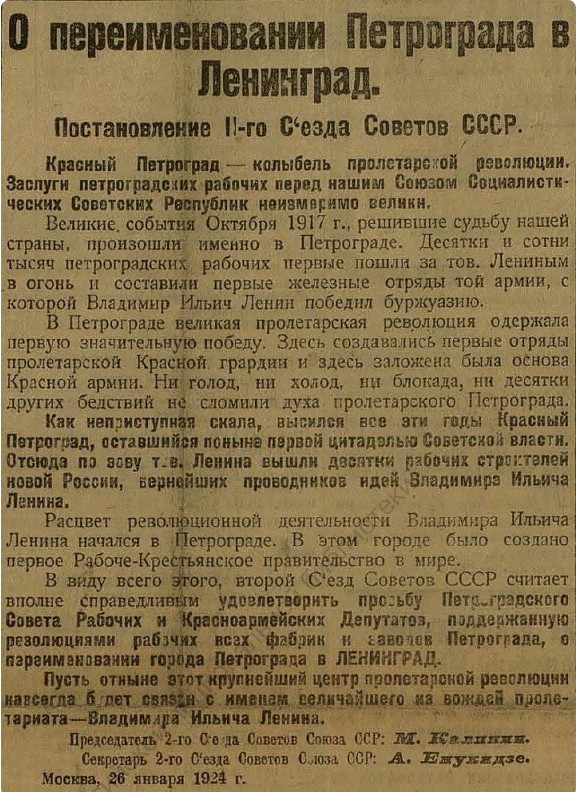 «26» января 1924 года Петроград был переименован в город Ленина - Ленинград. Инициатором переименования выступил Петроградский Совет рабочих, крестьянских и красноармейских депутатов. Предложение депутатов было поддержано рабочими всех фабрик и заводов Петрограда. Ещё «22» января 1924 года Григорий Евсеевич Зиновьев написал письмо председателю Петроградского совета письмо, в котором предлагал переименовать Петроград в Ленинград. «23» января 1924 года на чрезвычайном заседании Петроградского совета оно было зачитано и тут же поддержано. Григорий Зиновьев писал: «Расцвет политической деятельности Владимира Ильича начался в Петрограде. Решающие события Великого Октября, которыми руководил Владимир Ильич, произошли в Петрограде ... Пусть наш великий пролетарский город будет связан с именем величайшего вождя и любимейшего учителя международного рабочего класса».