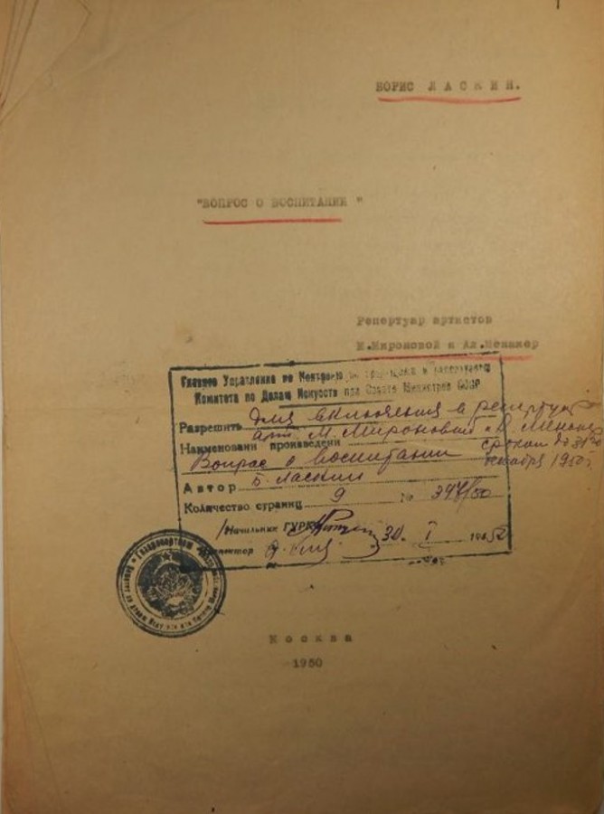 - Тит. лист миниатюры Б.Ласкина «Вопрос о воспитании», 1950 г.