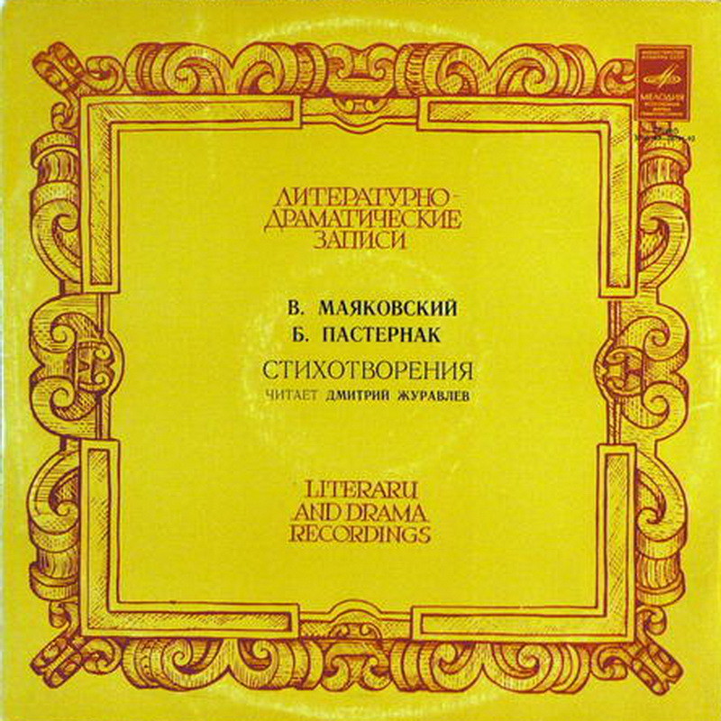 Новая пластинка Дмитрия Николаевича Журавлёва посвящена Владимиру Маяковскому и Борису Пастернаку. Уже в первом афишном концерте артиста в 1935 году, Маяковский стал рядом с Пушкиным - целое отделение: стихи о творчестве. «Событием, открывшим мне поэта Маяковского, - рассказывает Журавлёв, - было появление «предсмертного и бессмертного», по выражению Бориса Леонидовича Пастернаке, первого вступления в поэму о пятилетке - «Во весь голос». Я был захвачен, потрясен. С тех пор Маяковский навсегда вошёл в мою жизнь и работу... Меня захватило именно лирическое начало в таком мужественном творчестве Маяковского». В репертуаре артиста - «Юбилейное», «Разговор с фининспектором о поэзии», «Сергею Есенину», «Письмо товарищу Кострову из Парижа о сущности любви», «Мелкая философия на глубоких местах», стихи из парижского и американского циклов и еще многие стихотворения, Октябрьская поэма «Хорошо», фрагменты из поэмы «Владимир Ильич Ленин». Глубочайший лирический смысл, спрятанный то за героической, высоко-гражданственной, то за иронической а порою и за трагической интонацией поэта, ощущался артистом во всех исполняемых им вещах. Журавлев остро передаёт мощь и многогранность личности Маяковского, «его щемящую сердце лиричность», резкие переходы от могучей приподнятости к совсем простым, почти разговорным интонациям. Своё ощущение глубокого и серьёзного разговора Маяковского с читателями (слушателями!) он всегда старается воплотить в своем исполнении. Отсюда простая разговорная интонация артиста, всякое отсутствие «громоподобия». Ораторский приём и посыл Маяковского облегчали всегда мою работу над его стихами, - пишет Журавлёв. - Они созданы для произнесения, для того, чтобы слушали. И впечатляет Маяковский, по моим наблюдениям, больше, когда он звучит, нежели, когда читаешь его глазами, потому, что поэт весь в общении, в обращении к слушателям. Большинство его стихов пронизано этим: