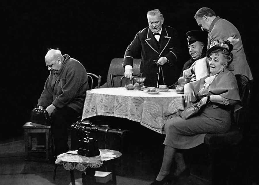 - А.Грибов (в роли Райнера), М.Яншин (в роли Абеля), В.Станицын (в роли инспектора Мич), М.Прудкин, (в роли Хмелика), О.Андровская (в роли пани Конти) (слева направо)