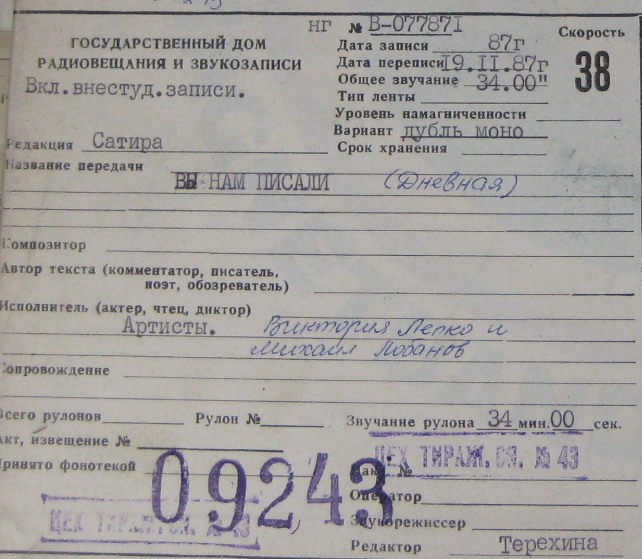 Дата переписи эфира: 19.11.1987