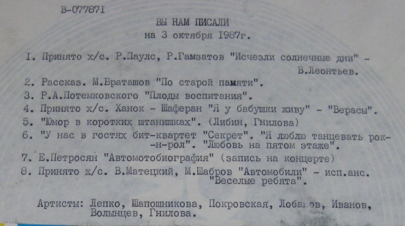 Всесоюзное радио - Вы нам писали - (В.Леонтьев, вед. В.Лепко, М.Лобанов, 03.08.87)
