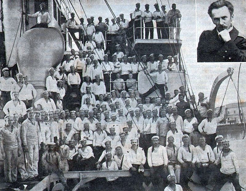 - Команда крейсера "Очаков" за две недели до восстания 1905г. и лейтенант Шмидт (в верхнем правом углу)