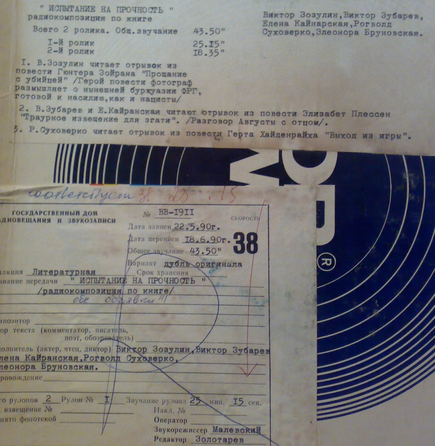Вашему вниманию фрагмент радиокомпозиции Всесоюзного радио СССР по книге "Испытание на прочность". В передаче в исполнении артистов московских театров звучат страницы из произведений (повести) четырёх западногерманских писателей -