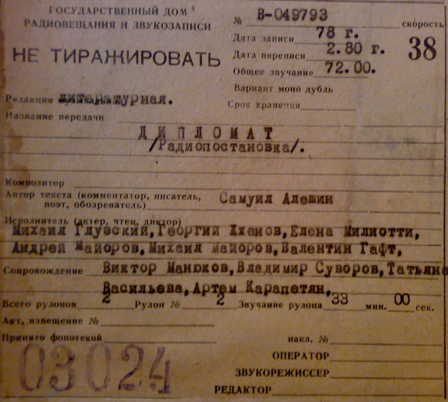 Алёшин С. - Дипломат - (исп.: М.Глузский, Г.Жжёнов, М.Погоржельский, Е.Миллиоти, Т.Васильева, А.Карапетян, В.Гафт, М.Майоров, и др.), (часть 2-я из 2-х), (Зап.: 1978г.)