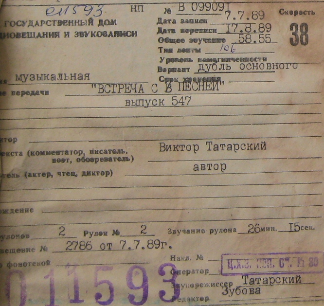 Всесоюзное радио - Встреча с песней вып. 547(авт. и вед. В.Татарский. зап. 1989г)
