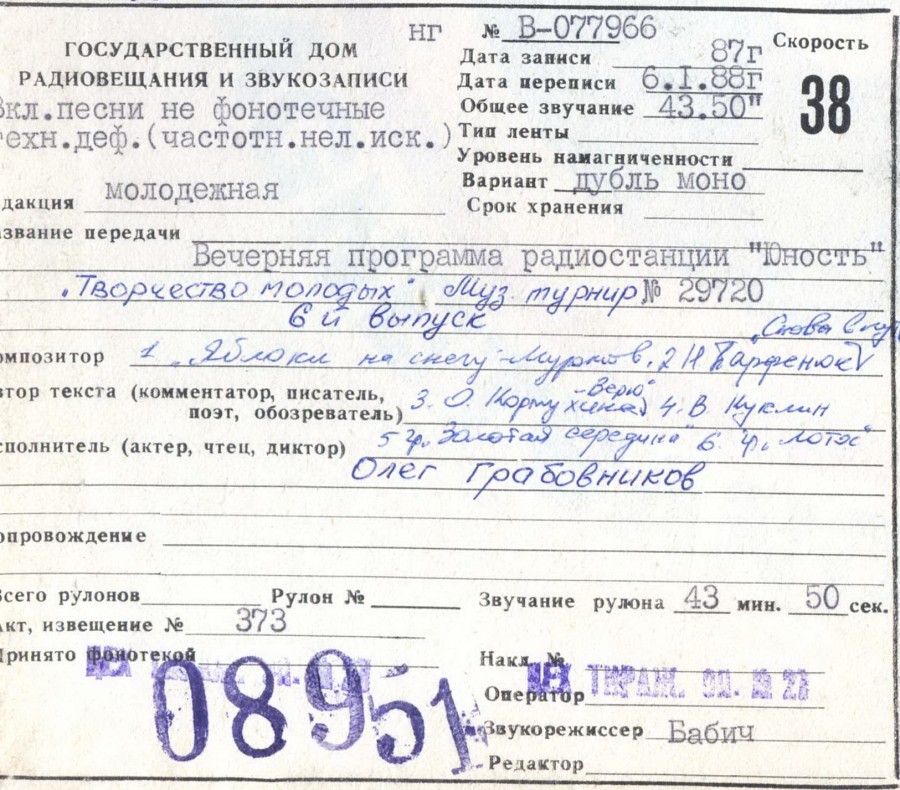 Радиостанция Юность - Творчество молодых (вед О.Грабовников 6й вып. 1987г)