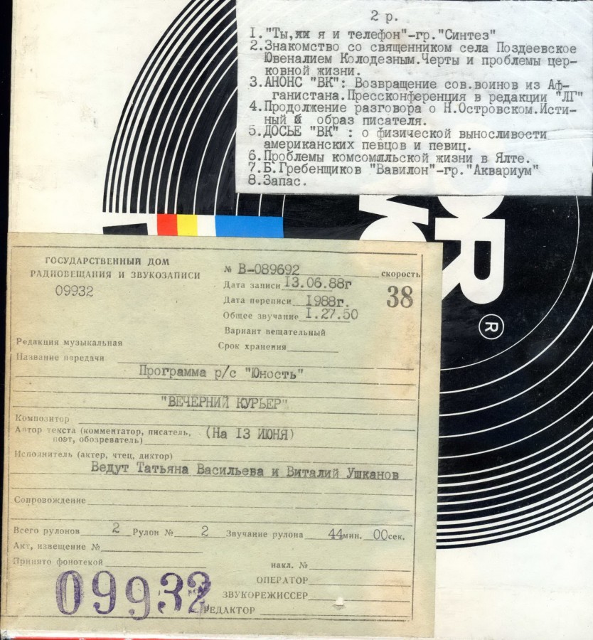 "Вечерний курьер" - информационно-музыкальная передача радиостанции Юность, выходившая в конце 1980-х гг. В программе поднималось много острых вопросов, звучали репортажи корреспондентов с мест интересных событий, освещались злободневные, социальные темы и конечно же современная музыка. Всё это приковывало внимание и вызывало острый интерес радиослушателей.
