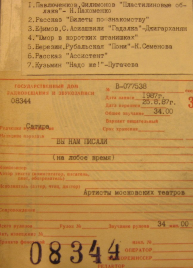 15:24 - Рубрика «Юмор в Коротких Штанишках». Чтение писем радиослушателей (вед. - поэт Михаил Н. Либин, озвучивание детского голоса - актриса Людмила В. Гнилова) - 4:30