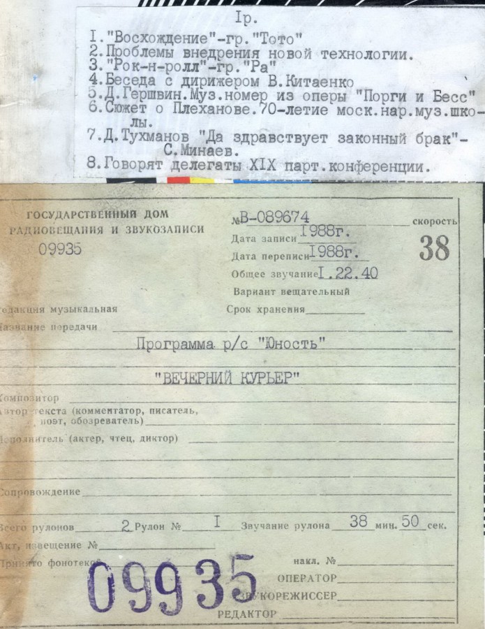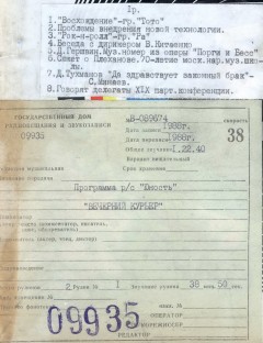 "Вечерний курьер" - информационно-музыкальная передача радиостанции Юность, выходившая в конце 1980-х гг. В программе поднималось много острых вопросов, звучали репортажи корреспондентов с мест интересных событий, освещались злободневные, социальные темы и конечно же современная музыка. Всё это приковывало внимание и вызывало острый интерес радиослушателей.