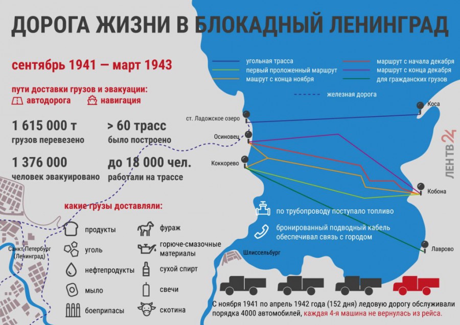«Дорога жизни» - во время Великой Отечественной войны единственная транспортная магистраль через Ладожское озеро. В периоды навигации - по воде, зимой - по льду. Связывала с 12 сентября 1941 по март 1943 года блокадный Ленинград со страной. Автодорога, проложенная по льду, часто называется Ледовой дорогой жизни (официально - Военно-автомобильная дорога № 101 (№ 102)). У маяка Осиновец существует также музей «Дорога жизни».