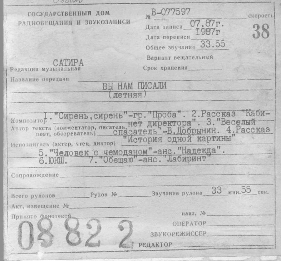 Передача отдела сатиры и юмора Всесоюзное радио Гостелерадио СССР: «ВЫ НАМ ПИСАЛИ» (летняя)