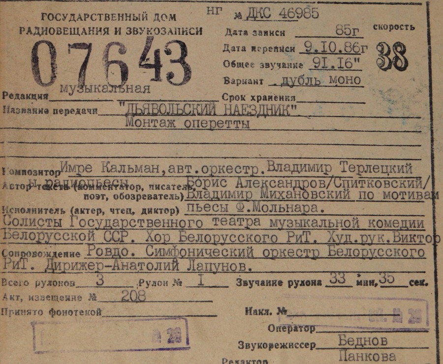 Кальман И - Дьявольский наездник - по мотивам пьесы Ф.Мольнара (монтаж оперетты ГТМК БССР зап.1985г ч1 из 3х)