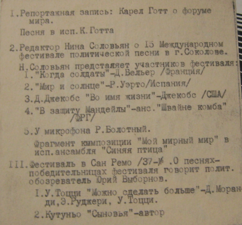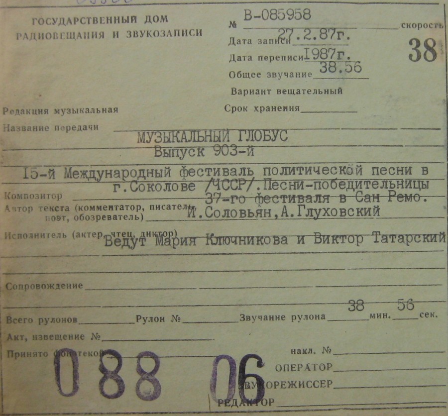 Всесоюзное радио – Музыкальный глобус вып.903(авт. и вед. В.Татарский и М.Ключнокова) зап.1987г.
