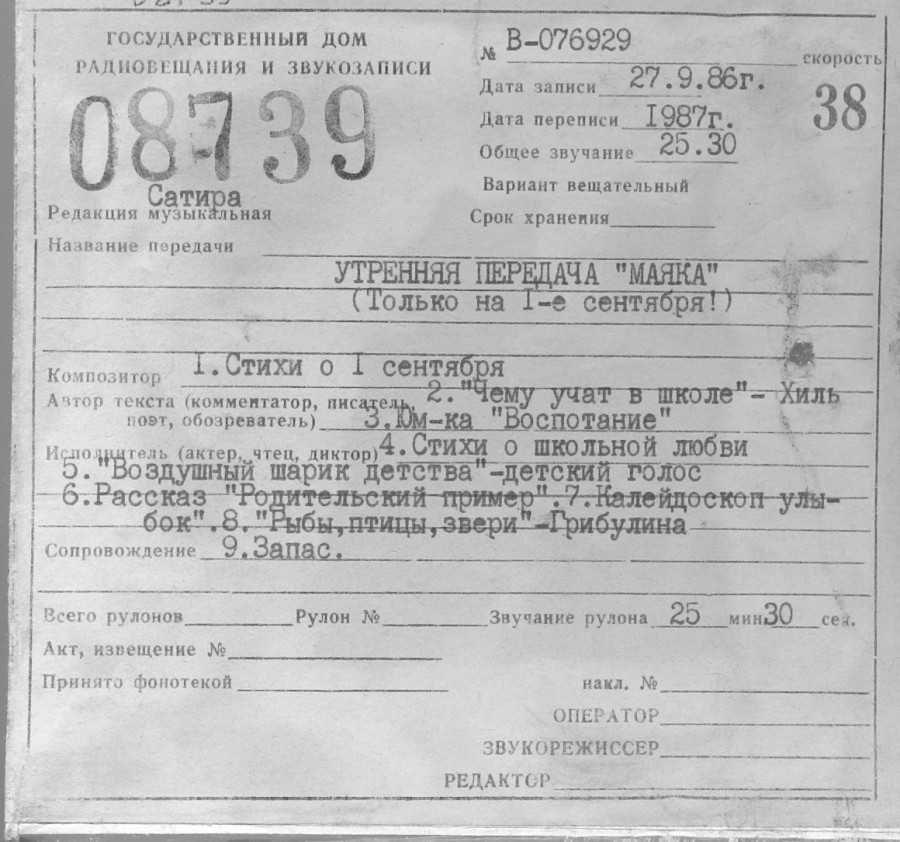 Всесоюзное радио - Утренняя передача Маяка (только на 1-е сентября 27.9.86г)