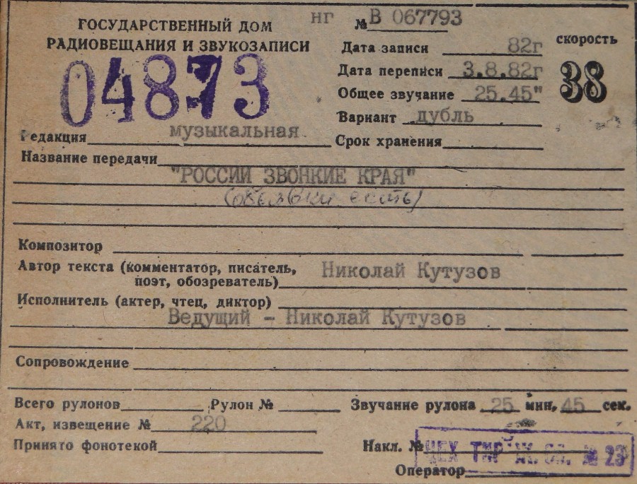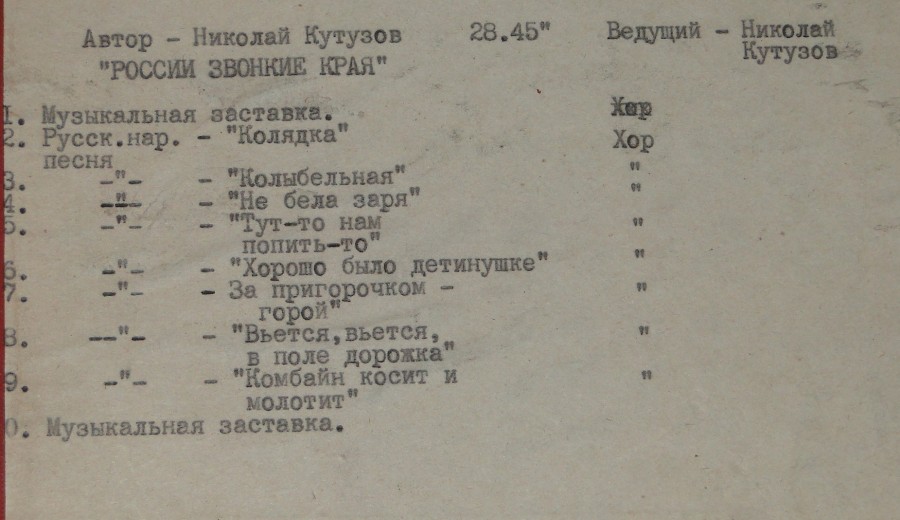 Радиопередача - России звонкие края (вед. композитор Н. Кутузов зап.1982г)