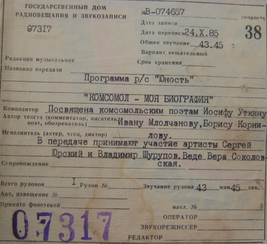 Радиостанция Юность - Комсомол - моя биография (зап 24.Х.85)
