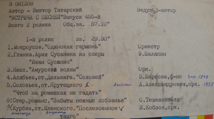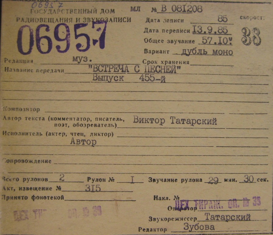 Всесоюзное радио - Встреча с песней вып. 455(авт. и вед. В.Татарский. зап. 1986г ч1 из 2х)