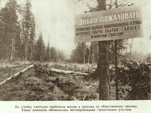 Железнодорожная магистраль Абакан-Тайшет - «Трасса мужества» - железная дорога, строившаяся в 1958-1965 гг. на территории Красноярского края, Хакасской автономной и Иркутской областей как продолжение железной дороги Новокузнецк - Абакан, построенной в 1949-1950 гг. Километраж начинается от станции Новокузнецк и заканчивается на станции Тайшет. Строительство дороги Абакан - Тайшет на XII съезде ВЛКСМ в 1954 году было объявлено Ударной комсомольской стройкой. На строительство железной дороги прибыло около 35000 комсомольцев-добровольцев с комсомольскими путёвками и молодёжь со всего Советского Союза. За самоотверженный труд сотни строителей «трассы мужества» были награждены правительственными и ведомственными наградами. Всего орденами и медалями было награждено 745 строителей. По завершении стройки министерство транспортного строительства СССР и ЦК профсоюза работников транспорта учредили памятный значок «Абакан-Тайшет» и вручили его 25000 лучшим строителям. Он стал первой в жизни наградой для многих тысяч самоотверженных молодых людей, прошедших при строительстве этой магистрали «школу жизни».