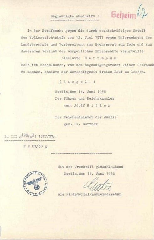 Лизелотта Германн (нем.: Liselotte Herrmann) (по прозвищу "Lilo") (23.06.1909г., г. Берлин - 20.06.1938г., расстреляна) - немецкая коммунистическая активистка сопротивления в нацистской Германии. Родилась в состоятельной семье. Её отец был инженером. Школьницей во Франкфурте-на-Майне Лизелотте впервые столкнулась с идеями социализма. Уже будучи абитуриенткой в Берлине она вступила в социалистический школьный союз Вильмерсдорфа (район Берлина), который тяготел к Коммунистической партии Германии (КПГ). В 1929 году Лизелотта Геррман приступила к изучению химии в Высшей Технической школе Штутгарта. В Штутгарте Лило Геррман продолжила свою политическую работу для Социалистического школьного союза. Курт Хагер, в то время 17-летний ученик реального училища, спустя десятилетия вспоминал как студентка (Лило Геррман) снабжала их журналами Социалистического школьного союза "Шулькампф" и материалами марксистской рабочей школы "Марш". Лило искала и нашла контакт с Коммунистическим союзом молодёжи. Время от времени она даже выполняла обязаности регионального кассира. Летом 1930 её приговорили к денежному штрафу за распространение листовок в Эсслингене. Лило можно было встретить в структурах, которые в те годы в Штутгарте относились к культурному окружению Коммунистической Партии: в (редакции) "Марш", в партийной книжной лавке, где работал её друг Лео Розенталь, позже поддерживавший её в Берлине. В 1930 году в Техническом институте Штутгарта сформировалась Красная студенческая группа из 25-40 членов, имевшая прямую связь с кружком оппозиционных преподавателей. Члены студенческой группы симпатизировали КПГ. Всеми доступными ей средствами группа пыталась противостоять корпоративным, в большинстве, студентам и политическому климату в институте, всё более и более обусловленному симпатией к нацистскому режиму. В конце января 1933, когда Гитлер уже был у власти, "надпартийный действующий комитет" Красной группы, Республиканских студентов и неорганизованных (попутчиков) выпустил ещё одну листовку с призывом бороться "вместе с рабочим классом против правительства Гитлера-Папена-Шлейхера и против политики захватнической войны и военной интервенции". С 1934 года Лило Геррман стала заниматься выпуском листовок, она печатала листовки сама в частном инженерном бюро своего отца, где она числилась штатным сотрудником. В то же время Лило работала совместно с Дитхельмом Шеером (член штутгарской организации КПГ) для секретной разведки КПГ, которая собирала доказательства нелегального вооружения нацистской Германии, публикуя об этом за рубежом разоблачающие книги. 7 сентября 1935 Лило Геррман была арестована. Основанием для ареста явилось обнаруженная при обыске в её квартире, где она проживала, светокопия с планом склада боеприпасов, расположенного вблизи городка Целле. 2 июня 1937 года было вынесено решение. Четыре смертных приговора: три из них Гёрицу, Штейдле и Лило Геррман за "измену родине, ведущую к государственной измене при отягчающих обстоятельствах"; и ещё один действовавшему в подполье районному руководителю КПГ Ловашу "за государственную измену при отягчающих обстоятельствах". Его штутгартский соратник Грёцингер за "подготовку государственной измены" получил 12 лет заключения, которые ему удалось пережить в концлагере Маутхаузен.