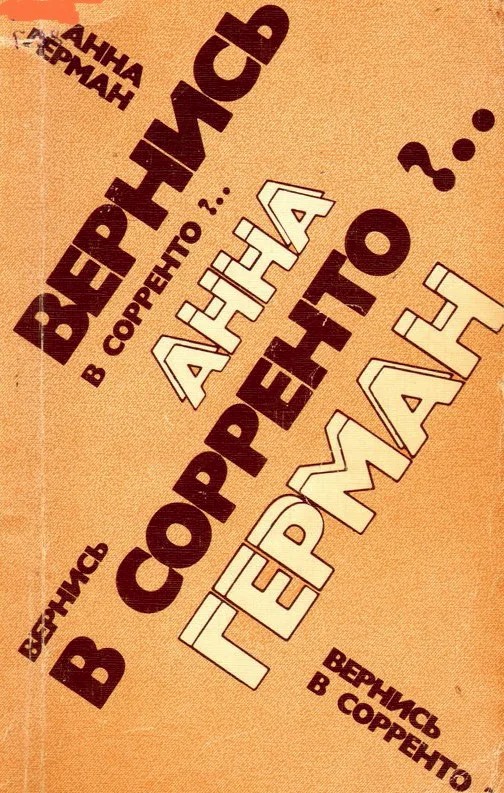 "Вернись в Сорренто ?" - Мемуары, 1970 год / В 1985-1988 гг. Изд-во "Радуга" выпустило книгу "Вернись в Сорренто ?". На обложке стояло имя автора - Анна Герман, однако состояла книга из двух частей. Первая часть - это "Вернись в Сорренто ? ", изданная Анной Геман в 1970 году, и вторая - воспоминания людей, которым посчастливилось знать Анну Герман, встречаться с ней или работать на одной сцене.