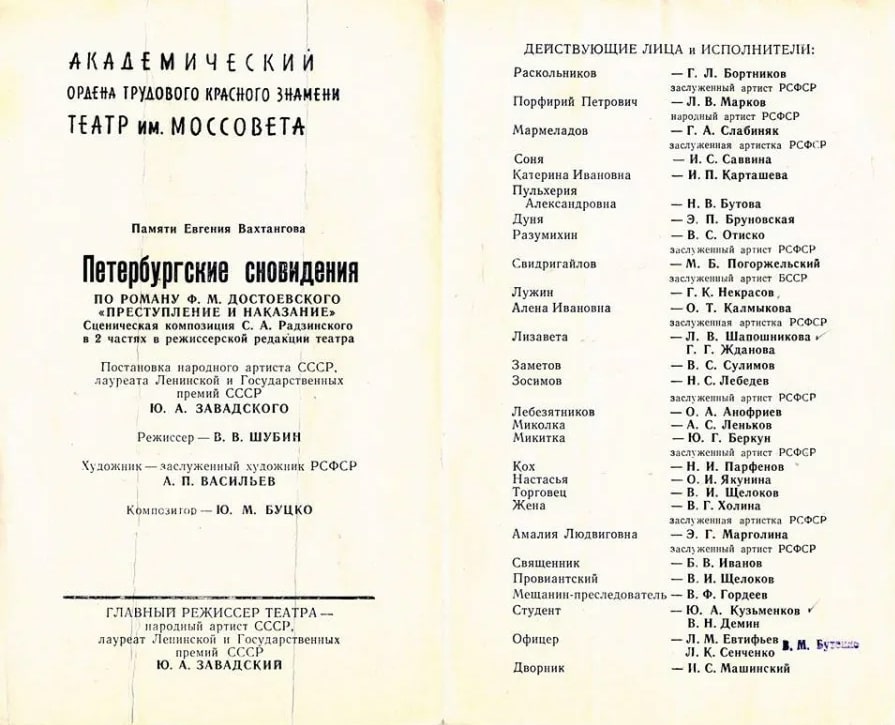 «Боже ! - воскликнул он, - Да неужели ж, неужели жив самом деле возьму топор... Ведь ещё вчера, вчера, когда я пошёл делать эту... пробу, ведь я вчера же понял совершенно, что не вытерплю...». Нет нужды углубляться в подробнейший пересказ или глубокий социально-исторический анализ потрясшей весь читающий мир трагедии петербургского студента Родиона Раскольникова. И потом, на основе тщательно выверенных систем доказательств, предсказывать пути, по которым может пойти сценическое истолкование гениального романа Федора Михайловича Достоевского «Преступление и наказание» (1866). Идет ли театр от выяснения предпосылок чудовищной «пробы» нищего студента или от этого вот душевного вопля «не вытерплю...», перевешивает ли в интерпретации «преступление» или «наказание» - в любом случае, кроме, пожалуй, поверхностно-криминалистического подхода, на первый план выходит Лицо (Раскольников) в его неразрешимом, кровавом конфликте с отвергшим законы справедливости Миром. Порою этот кардинальнейший конфликт разрешается средствами, имеющими достаточно отдаленное сходство с приемами самого Достоевского. Театр открыто перемещает акценты, сообразуясь со Временем постановки, меняет не только самый жанр повествования, но и купирует, казалось бы, абсолютно «некупируемые» пласты: компонует тексты монологов и диалогов, обходится вообще без авторского комментария, оставляет в тени важнейшие аспекты и образы великого романа. Недаром ни одна из попыток «перевести» социально-психологический роман-трагедию Достоевского на язык экрана или сцены не обходится без напряженной, острой критико-литературной или театроведческой полемики: слишком громадна глыба «перерытых в романе вопросов» (выражение автора). Роман, с которого начиналась мировая слава Достоевского, вот уже второе столетие исследуется, открывается снова и снова, с самых, казалось бы, основ замысла и средств его воплощения. Пожалуй, если бы возникла необходимость изложить сюжет в нескольких строках судебного репортажа, он был бы сведен к самому заурядному, «подлому» и грязному уголовному преступлению, к изощренной «ловле» преступника, его публичному покаянию и долгому искуплению крови на каторге. Но в этом немыслимом случае роман перестал бы быть романом и ни один театр не ощутил бы потребности в его каждый раз яркой и по-театральному эффектной интерпретации. Именно в неисчерпаемости общечеловеческой проблематики и гениальности художественного раскрытия всей громады «перерытых» вопросов бытия и духа, истории и человека в ней, социальной действительности и ее противоречий, тем потрясенной справедливости, гордыни и смиренности, мести и воздаяния, бездонности внутреннего мира хотя бы одного из Лиц – причина жадного интереса к роману Достоевского. В сущности, вполне можно было бы себе представить спектакли «Сонечка», «Свидригайлов» или «Катерина Ивановна», не говоря уже о спектакле «Раскольников». Чтобы постичь смысл общего и деталей хотя бы одного из них, иной раз недостанет и целой жизни, тем более немногих часов театрально-сценического действа. И, снова и снова, словно притянутый загадочным сильнейшим магнитом, театр и русский, и мировой стараются раскрыть глубины Достоевского. Перед тем как перейти к рассказу об одном из самых заметных, обросших большой и серьезной исследовательс
