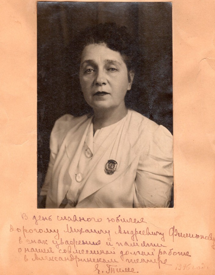 Елизавета Ивановна Тиме (24 августа [5 сентября] 1884г., г. Санкт-Петербург - 08.02.1968г., г. Ленинград) - русская драматическая актриса, театральный педагог, профессор, Народная артистка РСФСР (1957). Окончила Высшие женские (Бестужевские) курсы (1904). Учась на последнем курсе историко-филологического отделения, поступила в Петербургскую консерваторию по классу пения (1903–1906), а затем в Петербургское театральное училище (1905-1908). В 1908 году была принята в Александринский театр. За первые девять сезонов сыграла более 50 ролей, имея в сезоне от 7 до 11 новых ролей. Играла роли драматические, трагические, комедийные. Тиме участвовала в спектаклях Вс. Мейерхольда, которые он ставил в Александринском театре ("Дон-Жуан" Ж.-Б. Мольера, 1910 и "Маскарад" М. Лермонтоваь, 1917) и в трагическом представлении "Царь Эдип" задуманном Ю. Юрьевым в Театре трагедии в 1918 году. С годами актриса перешла на возрастные роли в тех спектаклях, где раньше играла героинь. Тиме с успехом выступала в оперетте. Хорошо поставленный голос позволял ей исполнять самые разные интересные партии. С 1928 года - исполнительница, режиссёр и педагог художественного слова. В чтецком репертуаре актрисы "Анна Каренина" Л.Толстого, "Хождение по мукам" А.Толстого, "Клим Самгин" М.Горького, произведения А. Пушкина, Н.Некрасова, Ги де Мопассана и др. С 1913 года занималась педагогической деятельностью. Преподавала в Школе сценических искусств А. Петровского, В Институте живого слова, в Ленинградском государственном институте театра, музыки и кино (ЛГИТМиК, ныне СПГАТИ), с 1951г. - профессор. Е.Тиме сыграла за свою жизнь в театре 186 ролей, выступая в драматических спектаклях, в опере, оперетте и балете.