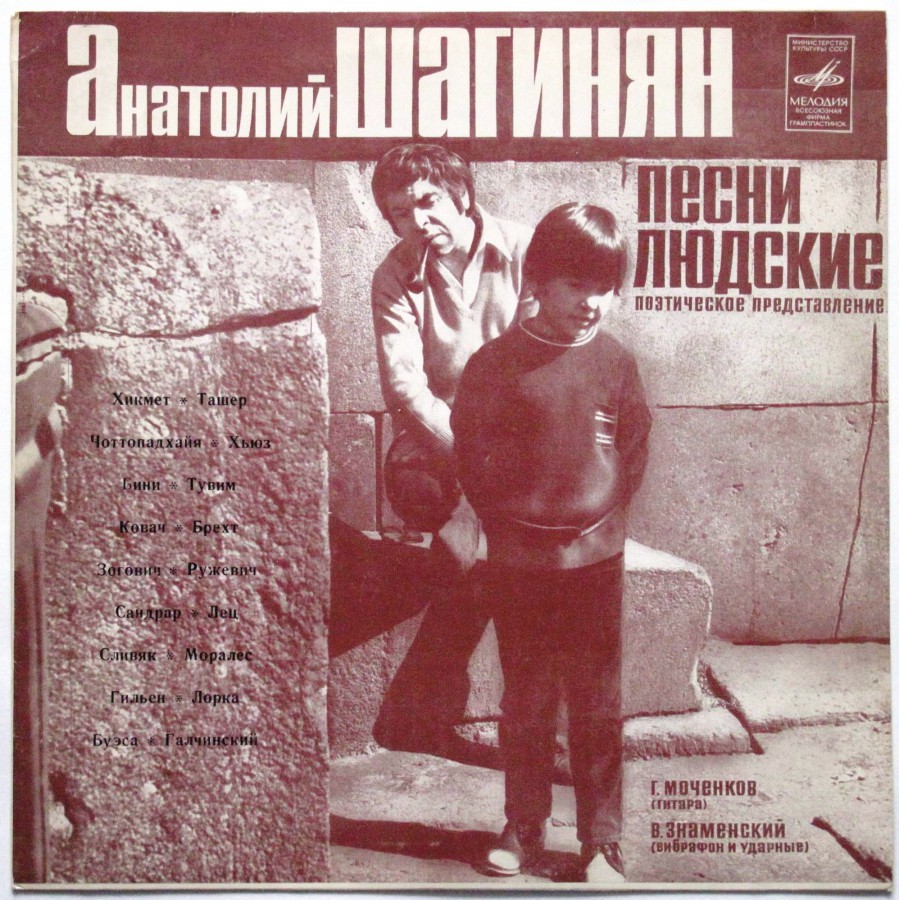 Анатолий Айкович Шагинян (1938 г.р.) - советский актёр, чтец, звукорежиссёр, продюсер. Окончил актёрский факультет Ленинградского театрального института. Некоторое время был актёром Ленинградского ТЮЗа, затем актёр Ленинградского Малого театра. Впоследствии ушёл на эстраду, артист Ленконцерта. Создал в Ленинграде «Театр одного актёра», играл спектакли по произведениям Платонова, Лорки, Хьюза, Брехта, и др.. Лауреат Всесоюзного конкурса артистов-чтецов за поэтический спектакль «Баллады, стихи и памфлеты Бертольда Брехта». В середине 1970-х гг. женился на пресс-атташе консульства Франции, француженке Мишель. В 1975 году эмигрировал во Францию. Составитель звуковой антологии «Песни людские».