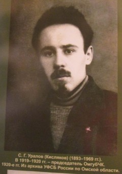 Сергей Герасимович Уралов (наст. фамилия - Кисляков) (1 [13] октября 1893г., пос. Миасского завода, Оренбургская губ. - 23 июня 1969г., г. Москва) - советский партийный и государственный работник; участник Февральской и Октябрьской революций. Родился в купеческой семье. В 1912-1917 гг. учился в Саратовском химико-механическом училище. В 1914 г. вступил в РСДРП(б). В 1916 г. дважды подвергался аресту за революционную деятельность. Участник Февральской революции (1917) в Москве, был агитатором Московского комитета РСДРП(б); затем - секретарь городской организации РСДРП(б) в Саратове. С июля 1917 г. состоял в центральном совете фабрично-заводских комитетов в Петрограде. Во время Октябрьского вооружённого восстания (1917) командовал отрядом революционных солдат - занял типографию, где начала печататься газета «Правда»; затем был помощником комиссара по делам печати Петрограда. В 1918г. работал в Высшем совете народного хозяйства. Летом 1918г. по заданию В. И. Ленина руководил созданием заграждений на Северной Двине с целью не допустить интервентов к Котласу. Некоторое время в 1918 г. охранял В. И. Ленина. С сентября 1918 года по май 1920 года - в ВЧК: инспектор для особых поручений, возглавлял следственный, а затем секретно-оперативный отделы, с марта 1919 года - член коллегии ВЧК, председатель Омской губернской ЧК и уполномоченный ВЧК при СНК РСФСР по Сибири, затем секретарь ВЧК при СНК РСФСР. С мая 1920г. по 1941г. - на аппаратных постах в ВСНХ, Наркомземе, Рабоче-крестьянской инспекции, Народном комиссариате путей сообщения РСФСР. С 13 июля 1930 по 26 января 1934 г. - член Центральной Контрольной Комиссии ВКП(б), с 11 февраля 1934 по 1939 г. - член Комиссии советского контроля при СНК СССР. Избирался делегатом XVII конференции ВКП(б) (30 января - 4 февраля 1932, с совещательным голосом). В 1941-1945 гг. служил в Красной Армии, участник Великой Отечественной войны. В 1945-1953 гг. работал в Минском областном комитете КП Белоруссии. С 1953 года - персональный пенсионер.