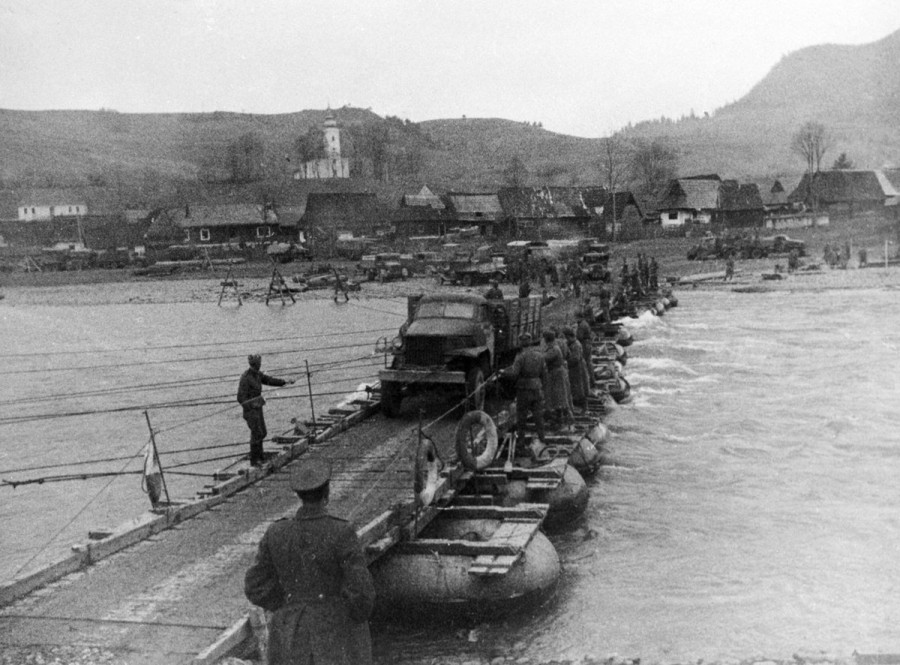 20 апреля 1945 года. Германия. Советские войска проходят по наведённому через реку Одер мосту.