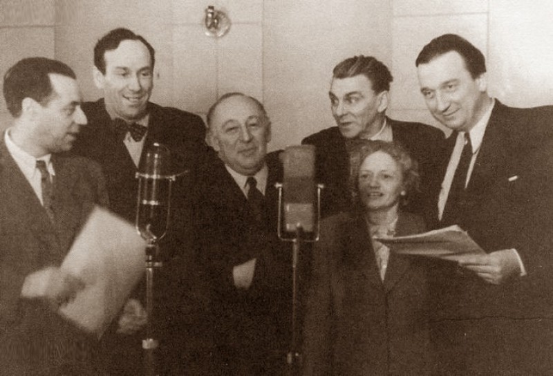 Р.Плятт, О.Абдулов (второй и третий слева), (рабочий момент записи радиопередачи "Клуб знаменитых капитанов")