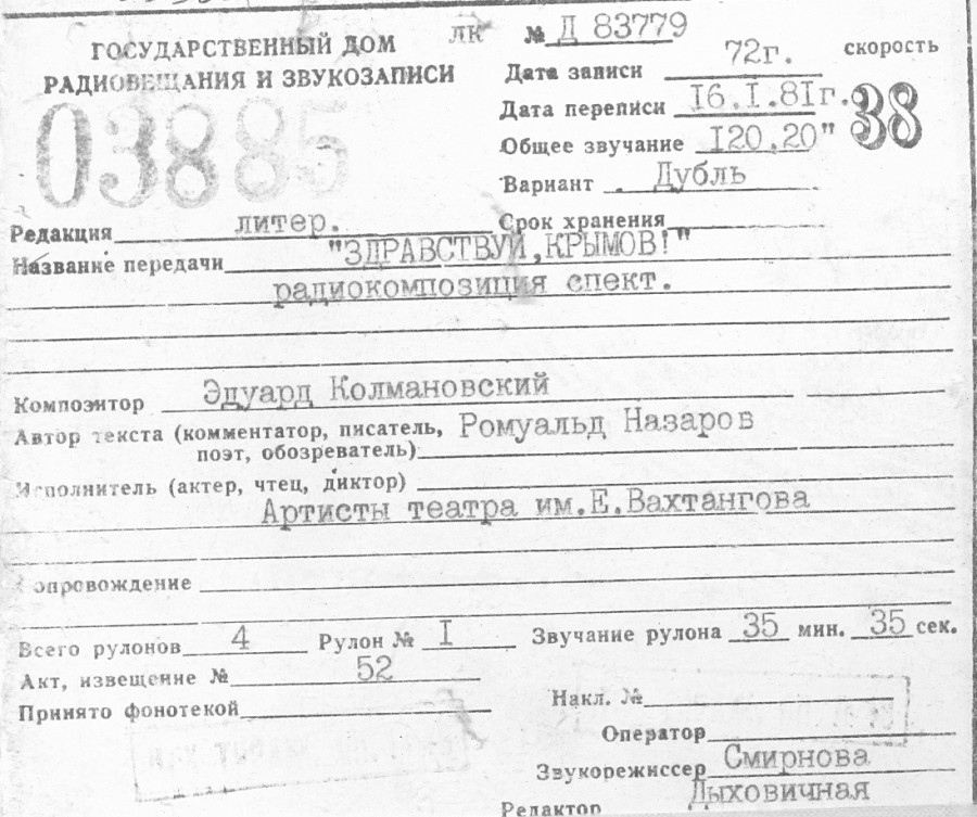 Назаров Р. - Здравствуй, Крымов - (исп.: Ю.Яковлев, И.Купченко, Л.Корнева, М.Вертинская, А.Галевский, В.Этуш, Г.Пашкова, Ю.Волынцев, А.Казанская, Л.Максакова, Э.Зорин, А.Данилович), (полн. верс.), (Зап.: 1972г.)