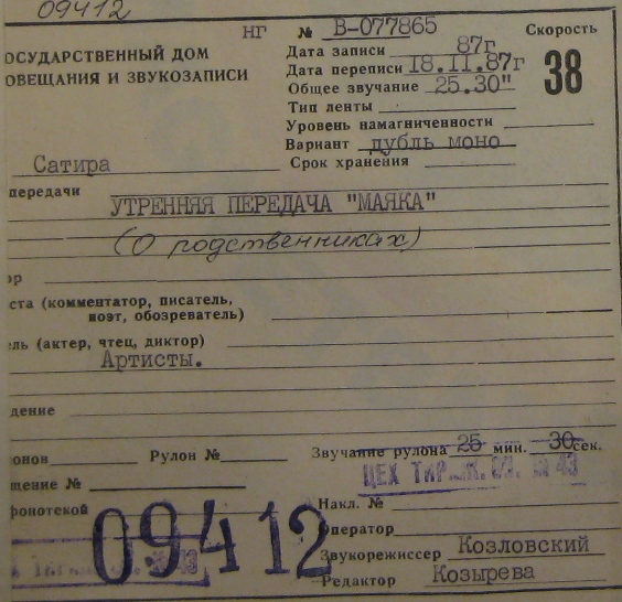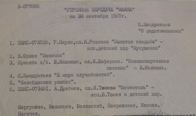 Утренняя передача Маяка (о родственниках зап.87г)