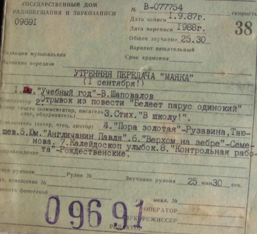 Утренняя передача Маяка - к 1 сентября (зап. 87г)