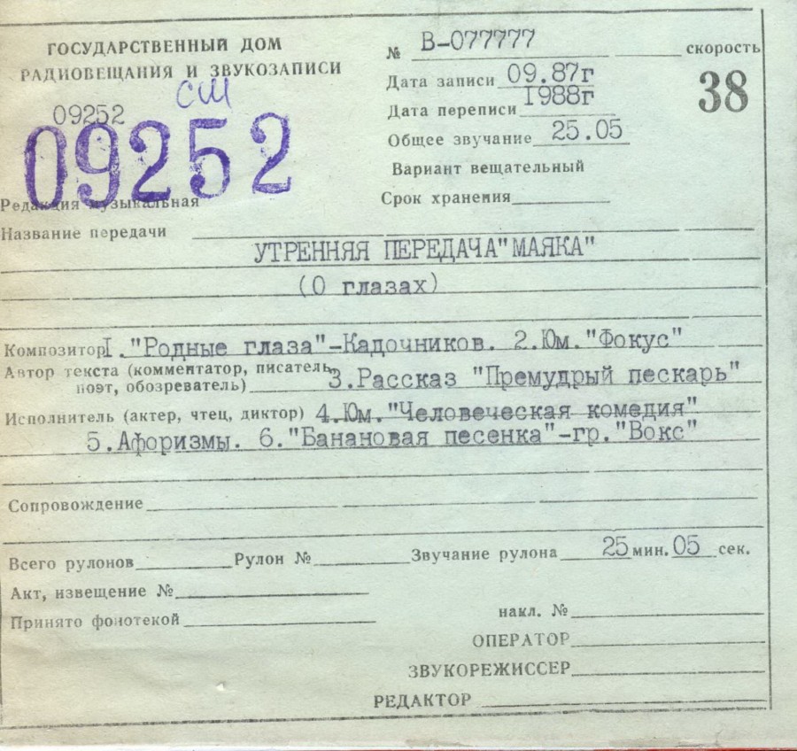 Утренняя передача Маяка (о глазах) (09.87г)