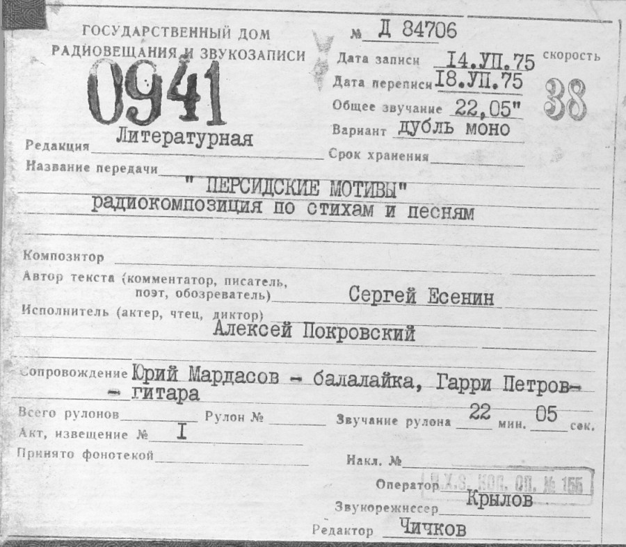 Есенин С - Персидские мотивы (р.комп. по стихам и песням исп.А.Покровский зап.14.7.75)