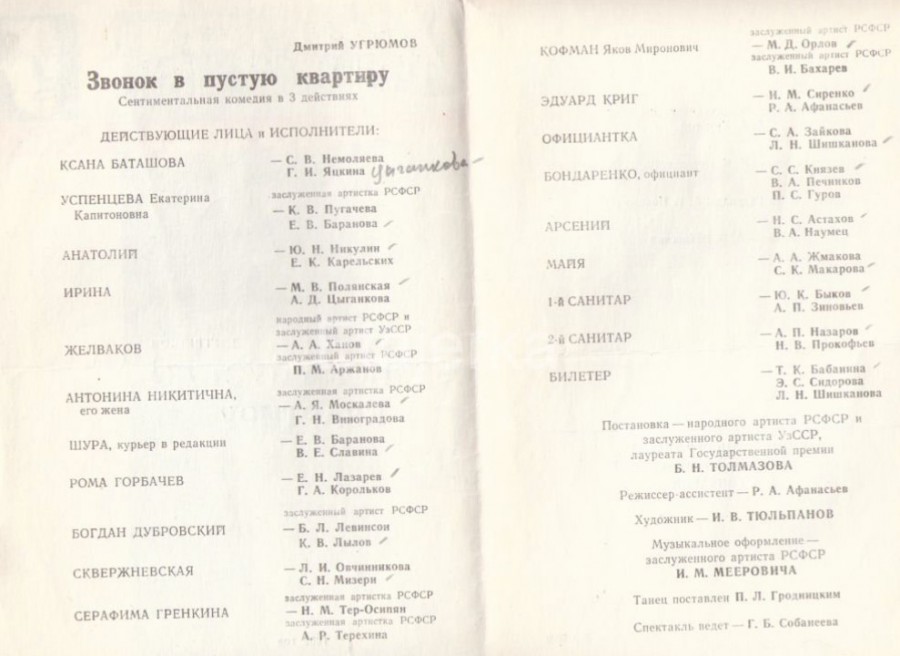 «Звонок в пустую квартиру» - Комедия в 6-ти картинах / [Послесловие нар. артиста СССР Н. Акимова]. - М.: Изд-во «Искусство», 1967 г.