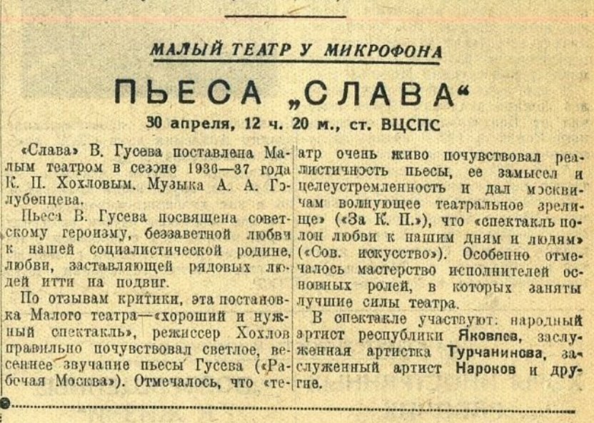 «Слава» - Пьеса, 1936 год.