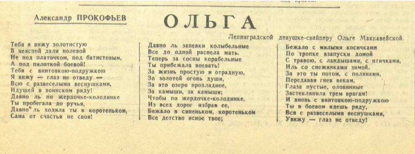 Ольга Алексеевна Маккавейская родилась в Московской области. В Белозерске жила с 1937г., закончила здесь среднюю школу в 1938г. В 1941 г. вместе с братом добровольно ушла на фронт. Была санинструктором, но после полученного ранения вернулась в роту автоматчиков, став снайпером. 27.10.1942г. была награждена медалью «За отвагу». О. Маккавейская - героиня одного из фронтовых очерков А. Фадеева.