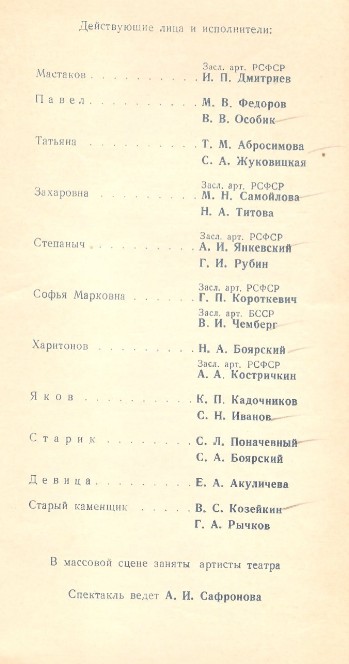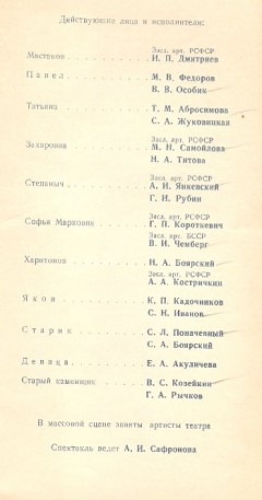Радиокомпозиция спектакля Ленинградского государственного драматического театра им. В.Ф.Комиссаржевской (ныне - Академический драматический театр им. В.Ф. Комиссаржевской) по одноимённой пьесе русского писателя Максима Горького в постановке Рубена Агамирзяна. Премьера спектакля состоялась на сцене театра 28 марта 1968 году.