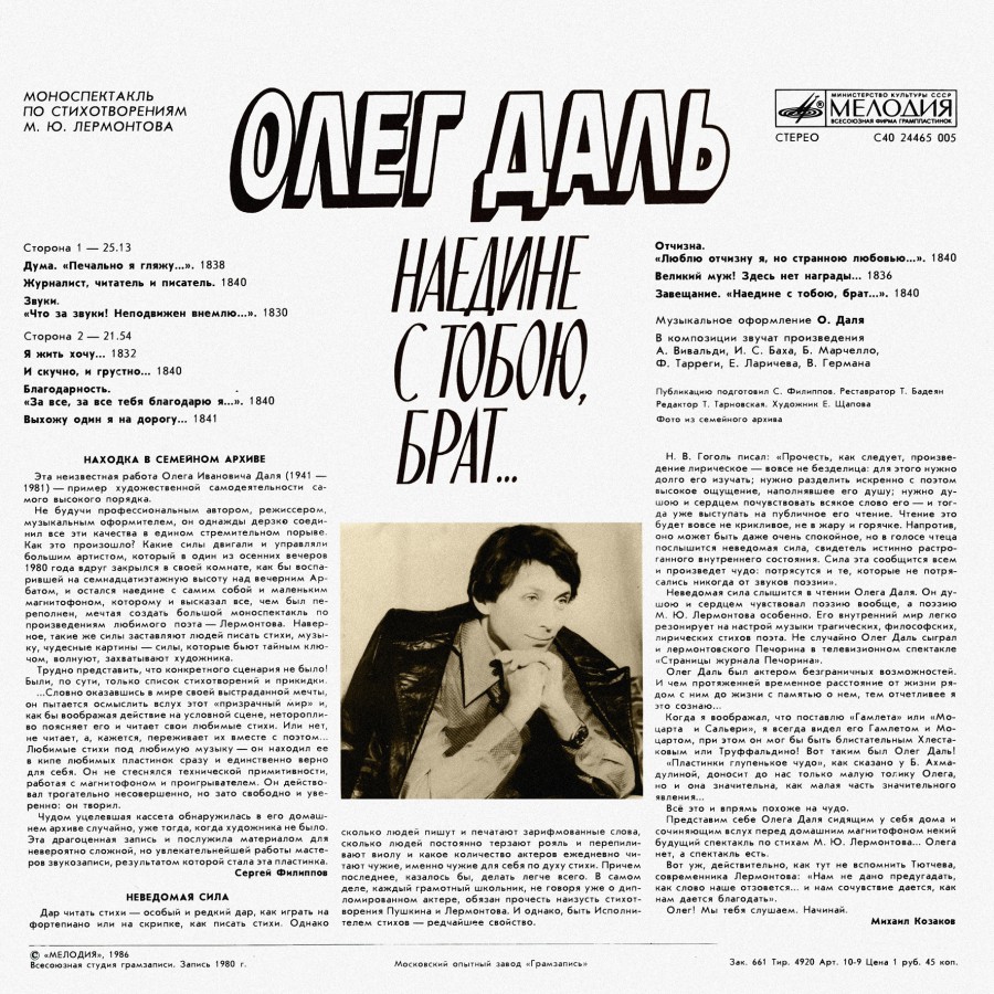 Запись с грампластинки Всесоюзной студии звукозаписи «Мелодия» - Моноспектакль Олега Даля «Наедине с тобою, брат...» составленный по стихотворениям М. Ю. Лермонтова. Расшифровка магнитозаписи домашнего прогона Олегом Далем моноспектакля.