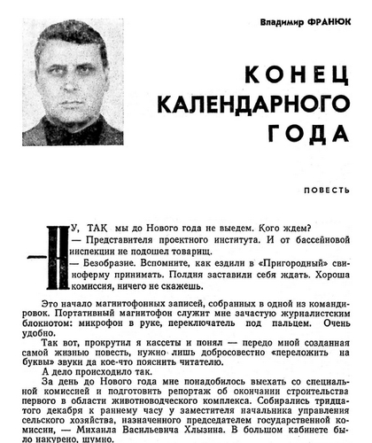 Владимир Анисимович Франюк (29.07.1931г., г. Харьков - 2003г., г. Москва) - советский и российский журналист, прозаик. Биографию Владимира Анисимовича составляют годы, проведенные им в школе, армии и поисках своего места в жизни. Так он попал в Заполярье, где ходил на промысловом судне матросом. Жизнь Франюком познавалась через труд. Диапазон трудовой деятельности Франюка - от полотёра до журналиста. В 1959 году в газете «Водный транспорт» был напечатан первый рассказ Франюка «Своё место», а в 1962 году в издательстве «Молодая гвардия» вышел авторский сборник рассказов Франюка «Пора надежд». Среди наиболее известных произведений Франюка повести «Круг», «Полированный шкаф» (1979).