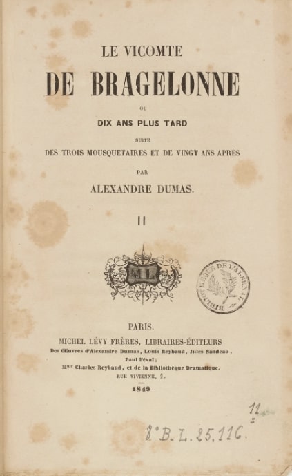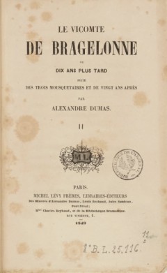 «Виконт де Бражелон, или Десять лет спустя» (франц.: Le Vicomte de Bragelonne, ou Dix ans plus tard) - Роман, 1850 год; цикл «Трилогия о мушкетёрах» / Другие названия: Виконт де Бражелон, или Ещё десять лет спустя; Десять лет спустя, или Виконт де Бражелон